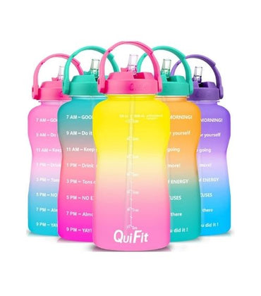 Quifit Motivational Water Bottle 64 Oz with Straw & Time Marker BPA (Yellow/Pink Gradient)